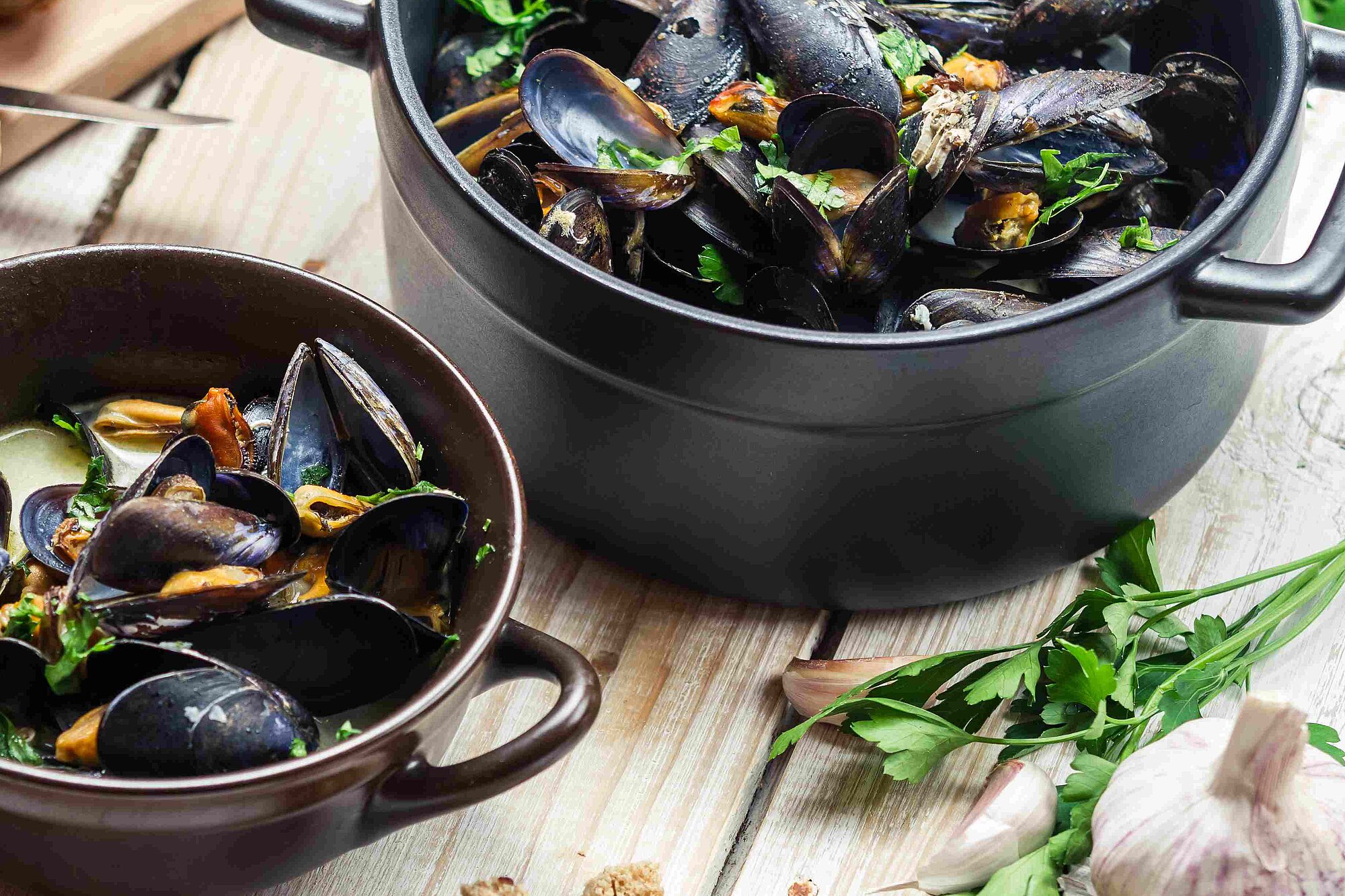 Drei verschiedene Moules klassisch serviert mit Baguette